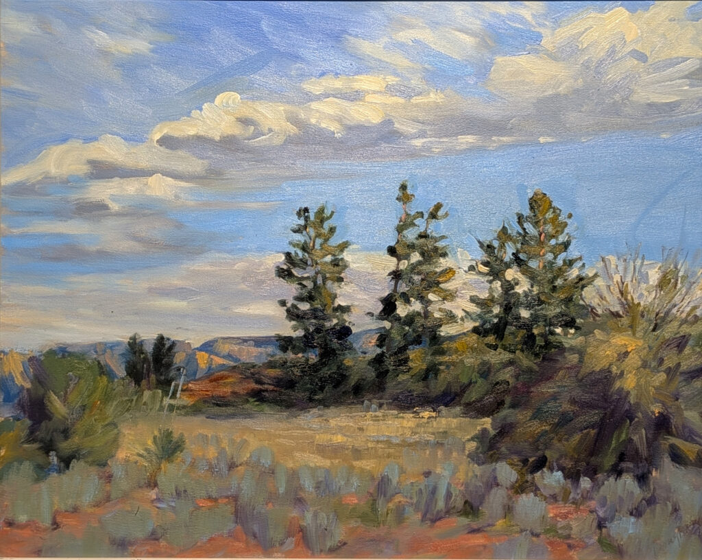 Yesterday I was painting alongside Dry Creek Road in Sedona with Krystal Brown and Laura Martinez-Bianco. We’re here for the 21st Annual Sedona Plein Air Festival. Unfortunately, I forgot to photograph my painting during daylight, and I’m afraid of the javelinas who hang out outside at night, so you’ll have to wait for that.